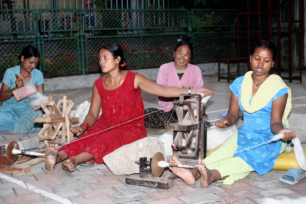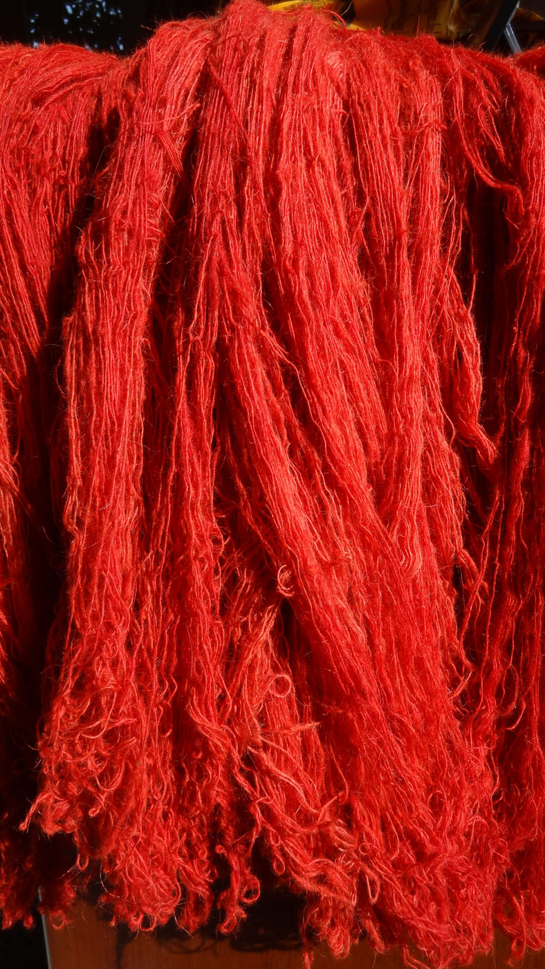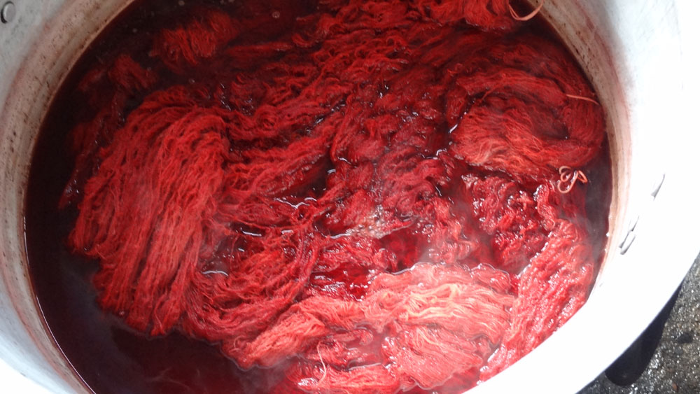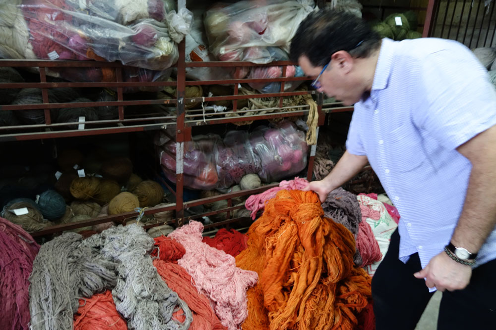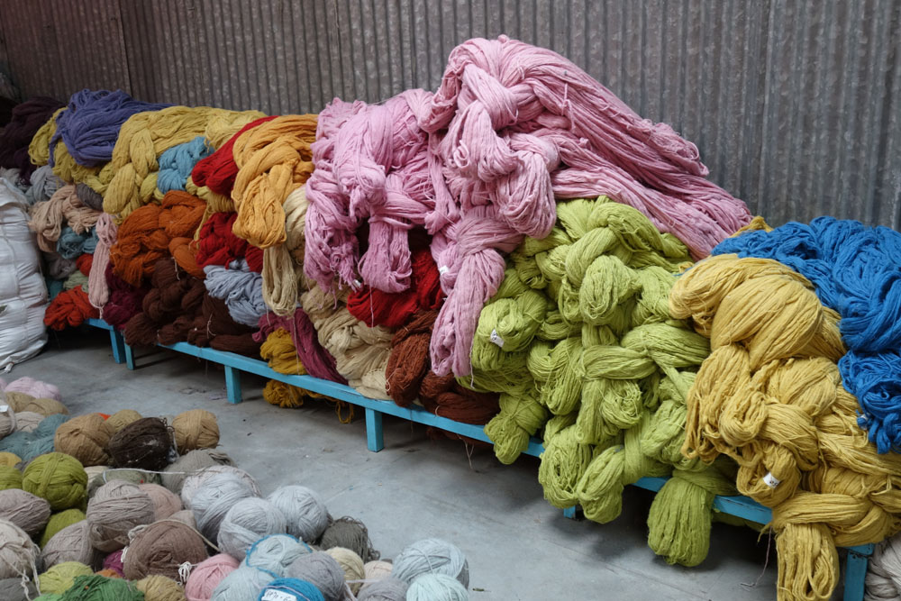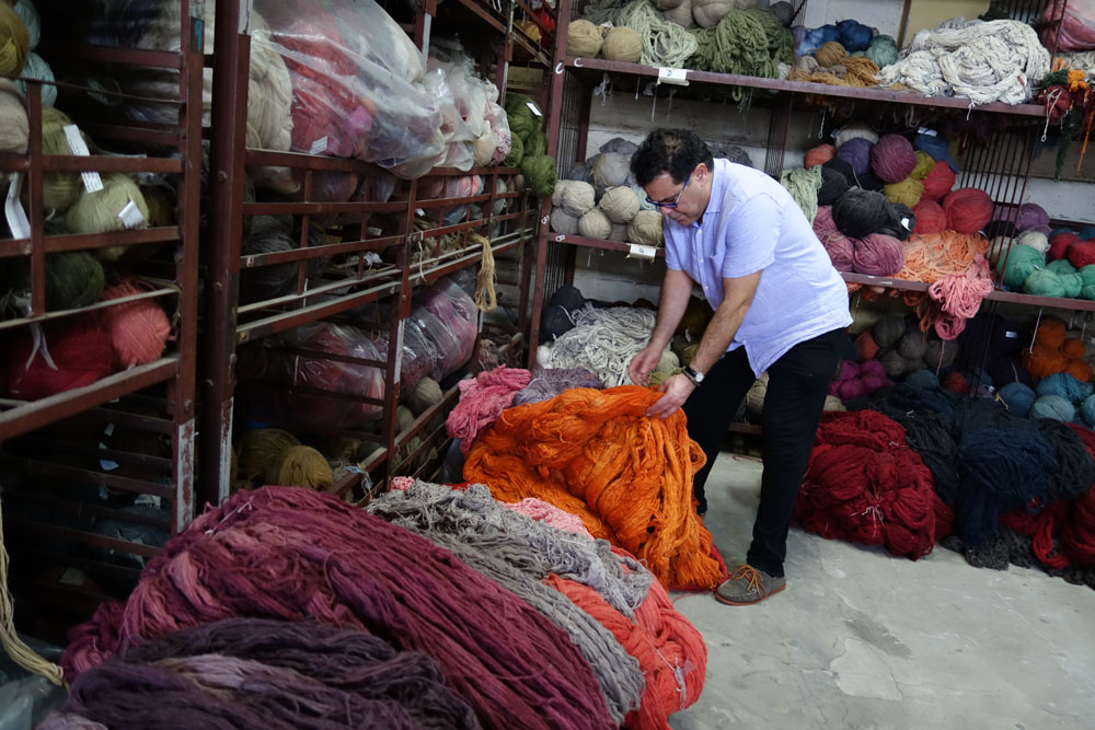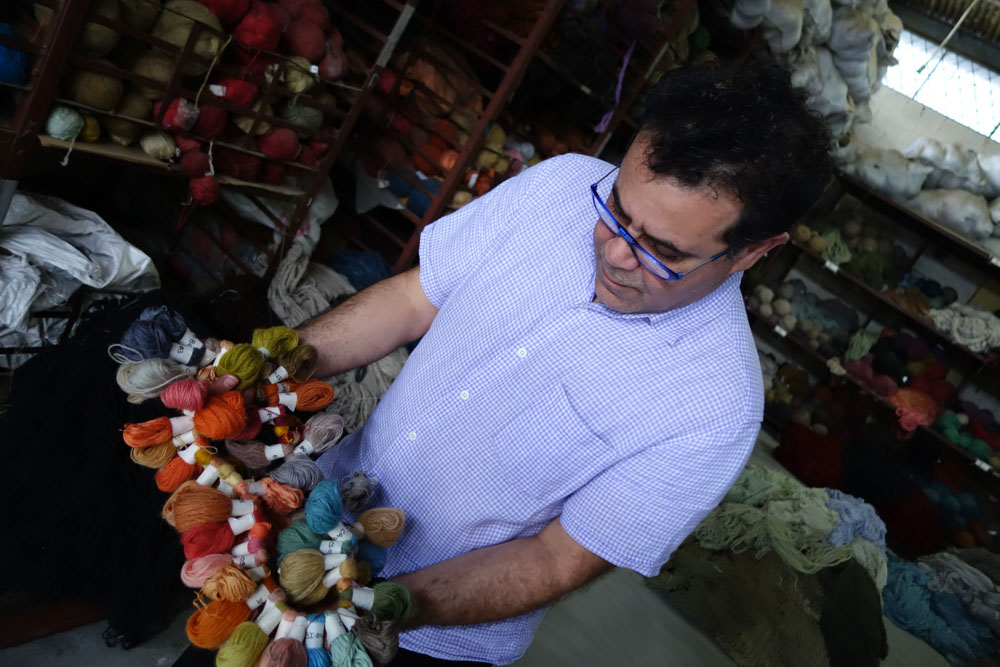 The yarns used throughout this collection are pure New Zealand Wool and Pure Natural Silk. The yarns arrive to the workshop in their raw form. Whilst being washed and spun into hanks by the weavers, the dye master develops the dye colours. He follows recipes for colours which have been used before but for this project also had to develop new shades and therefore new recipes. Where new shades were developed these were tested (sometimes a number of times) to ensure the shade was just right. Behruz travelled to the workshop to oversee this process and was there to approve each shade. Once the formula was ready, the liquid dyes are poured into heated vats where the wool or silk is then placed and stirred evenly to ensure perfect colour saturation. Once the colour is evenly spread throughout the yarns, the hank is then hung to dry before being colour checked and handed over for weaving.