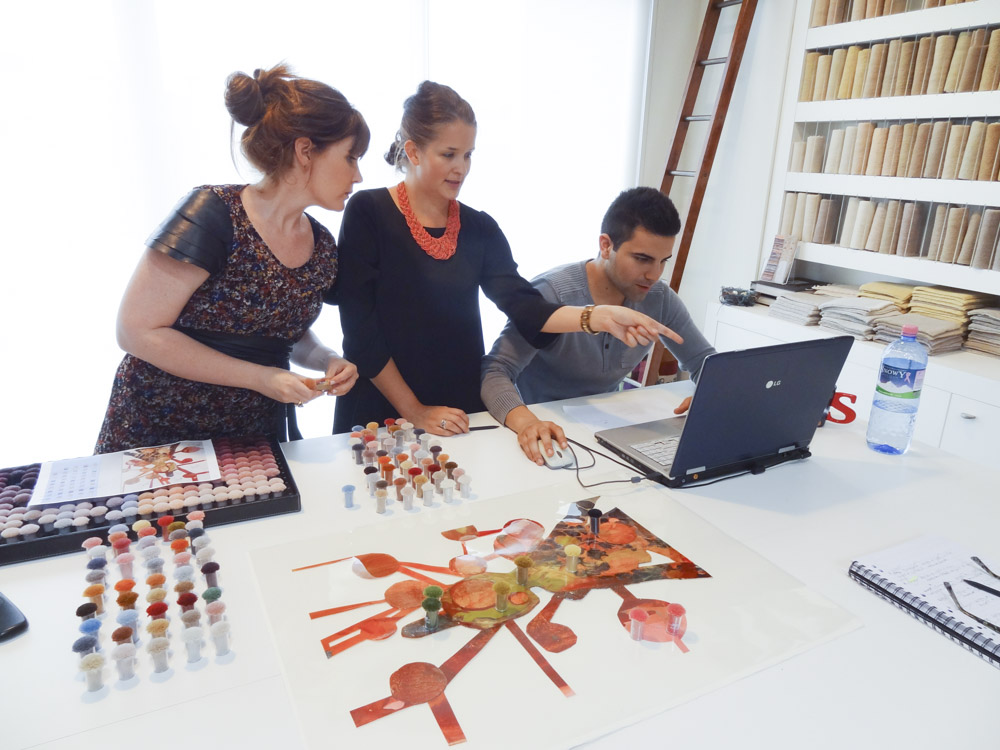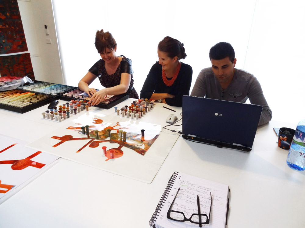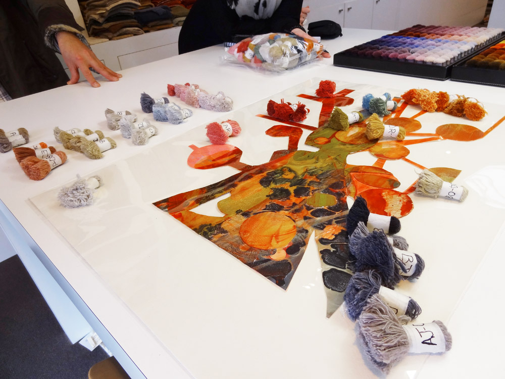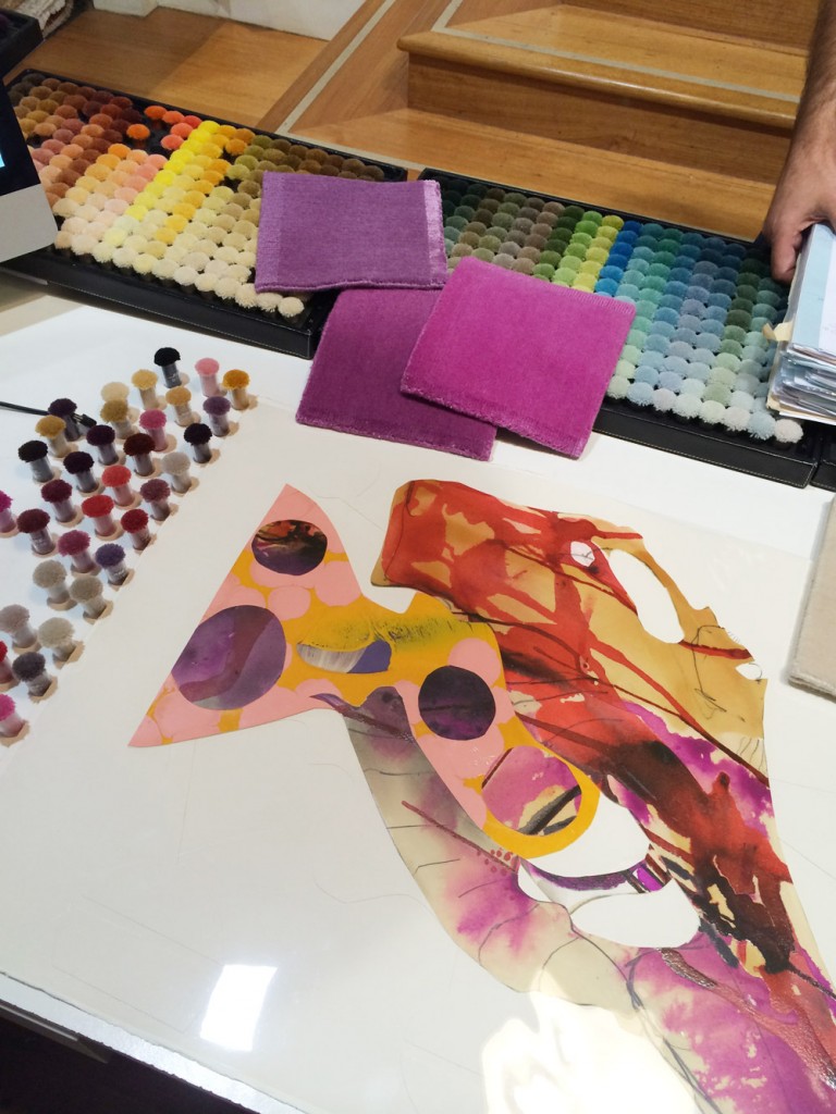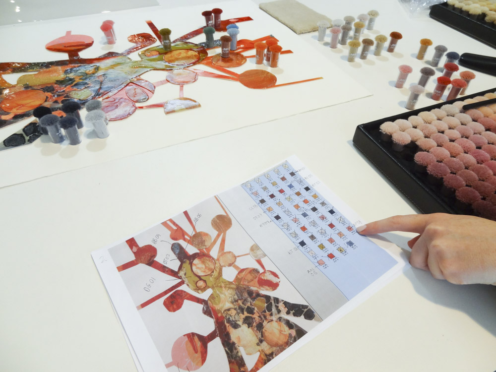 One of the most time consuming tasks for this project was colour matching every colour which exists in the original artworks. It was Behruz Studios task, specifically Bridget and Anna’s role, to ensure that all colours were matched to the same hues throughout and that no detail was missed. This meant ensuring that the colours took on the same effect as the globules of paint, splashes of ink and lines of pencil. Once the colours were selected, Amir then had to determine which yarns were to be wool or silk and the artworks themselves helped make this decision. Some of the areas of paint have an iridescent effect, so this naturally determined which areas would be woven in silk. Some areas, were flatter in effect so these were pure wool. Once the colours and yarns were selected, Robert and Simon were shown the final selections and the details were then given to the workshop for graphing and dyeing to begin.