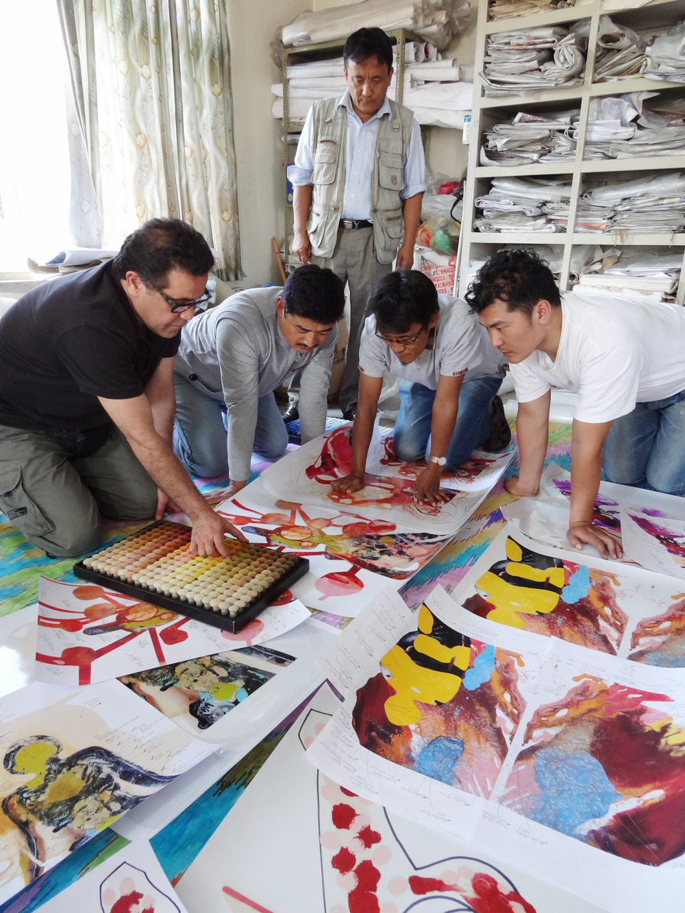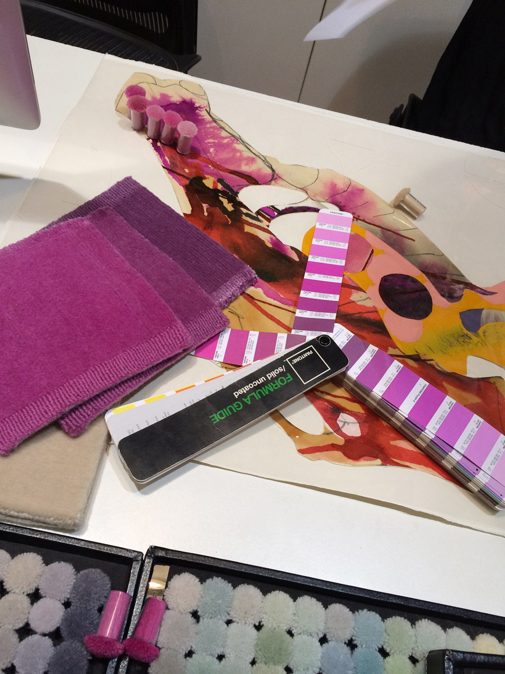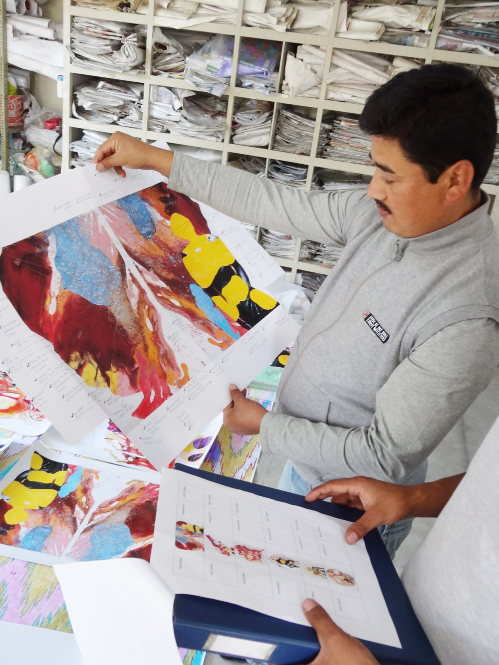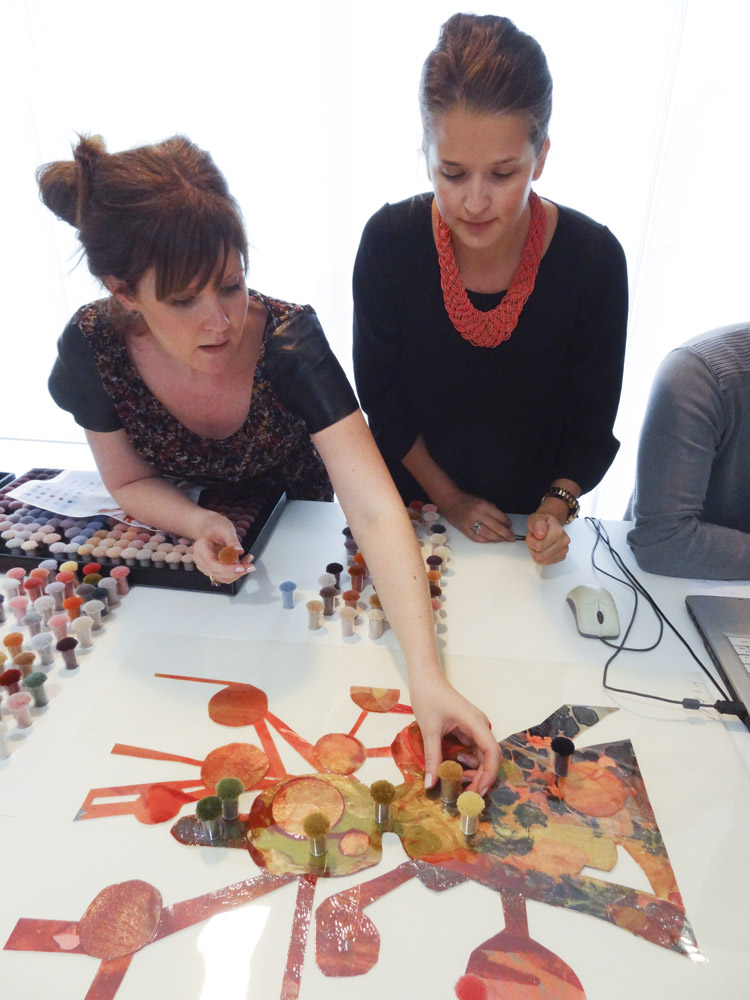 One of the most time consuming tasks for this project was colour matching every colour which exists in the original artworks. It was Behruz Studios task, specifically Bridget and Anna’s role, to ensure that all colours were matched to the same hues throughout and that no detail was missed. This meant ensuring that the colours took on the same effect as the globules of paint, splashes of ink and lines of pencil. Once the colours were selected, Amir then had to determine which yarns were to be wool or silk and the artworks themselves helped make this decision. Some of the areas of paint have an iridescent effect, so this naturally determined which areas would be woven in silk. Some areas, were flatter in effect so these were pure wool. Once the colours and yarns were selected, Robert and Simon were shown the final selections and the details were then given to the workshop for graphing and dyeing to begin.