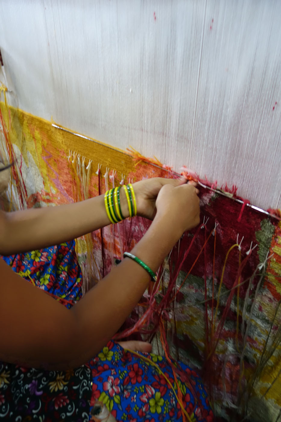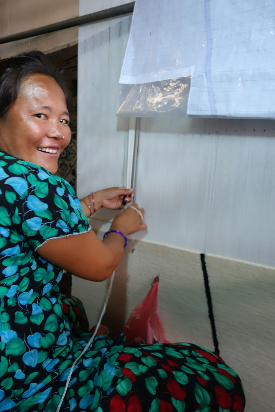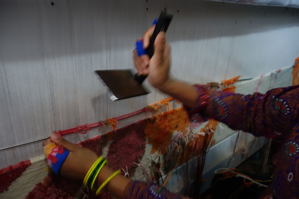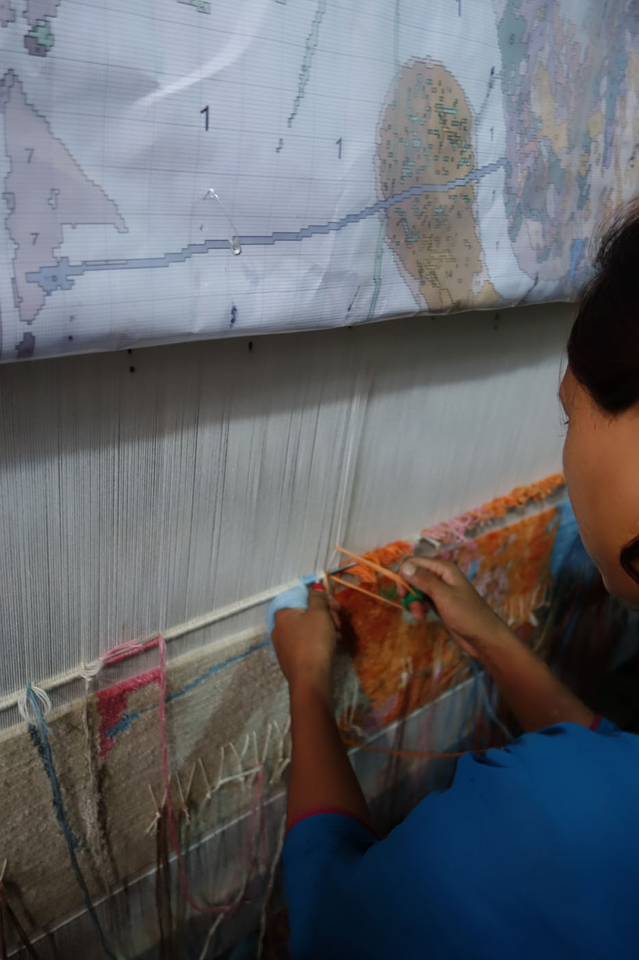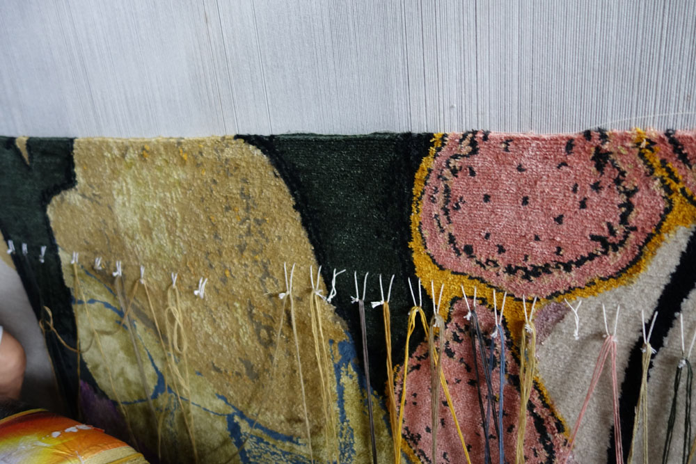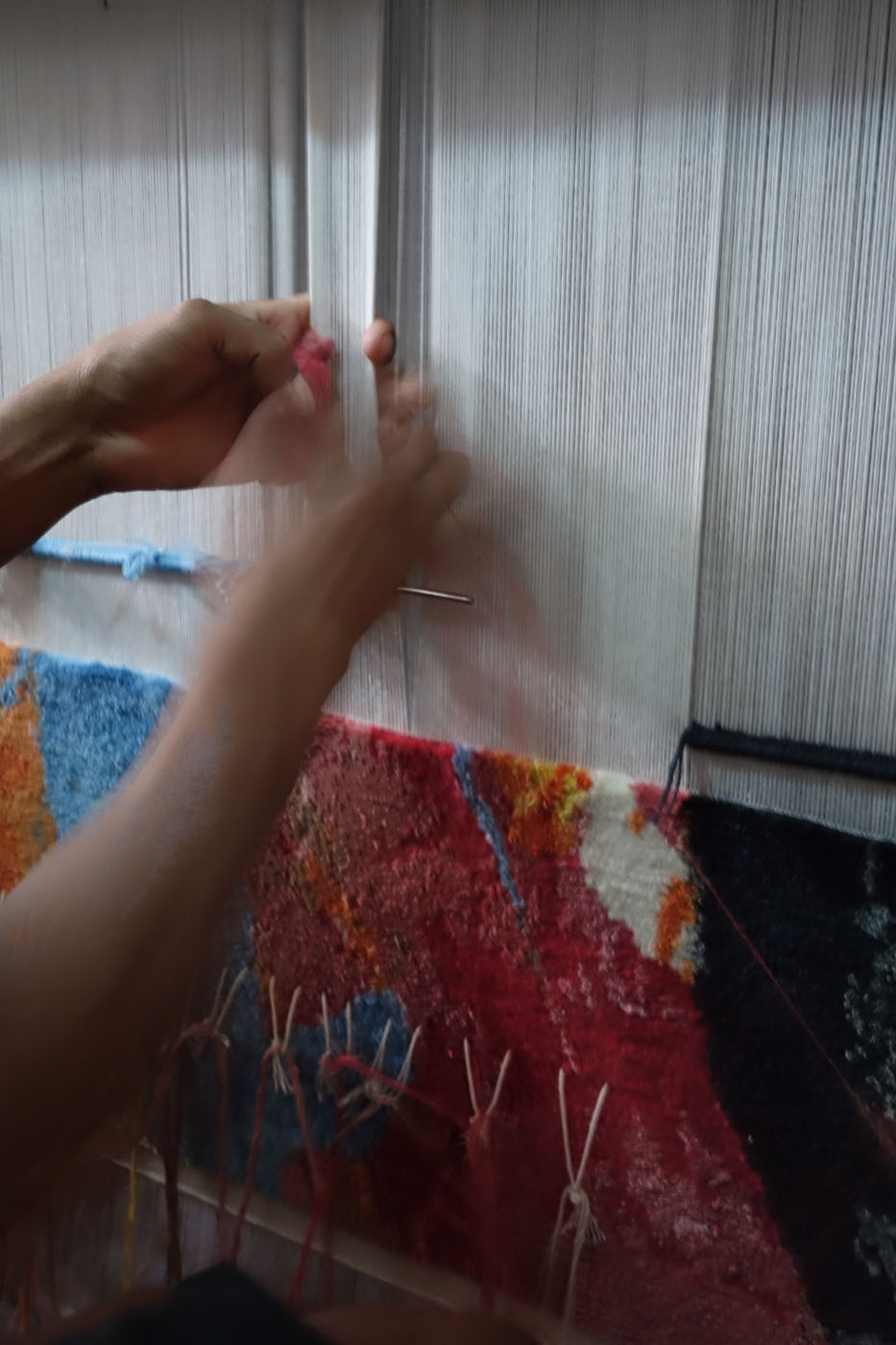 For this project, Behruz selected the most skilled weavers from the workshop. Although all weavers are very talented, some have a finer hand and due to the complexity in the designs this was an important asset to have. The weavers follow the graph in a ‘paint by numbers’ method with each dot of a square on the graph being one knot. They place the yarn around a metal rod and create rows of knots which are then cut with a sharp knife. Once cut, the yarns are then trimmed with scissors to form an even pile. The colours of this collection change very frequently so it was a skill in itself to follow the graph without error. Behruz travelled to Nepal frequently during the weaving process to ensure all colours were woven in the correct place and that the overall look of the weave was a representation to the artwork. With each visit, he was more and more impressed by the weavers who are artists themselves.