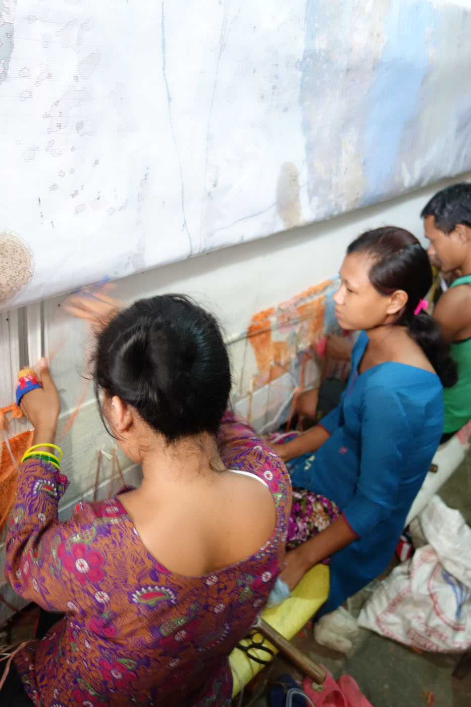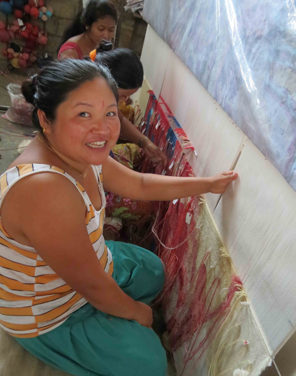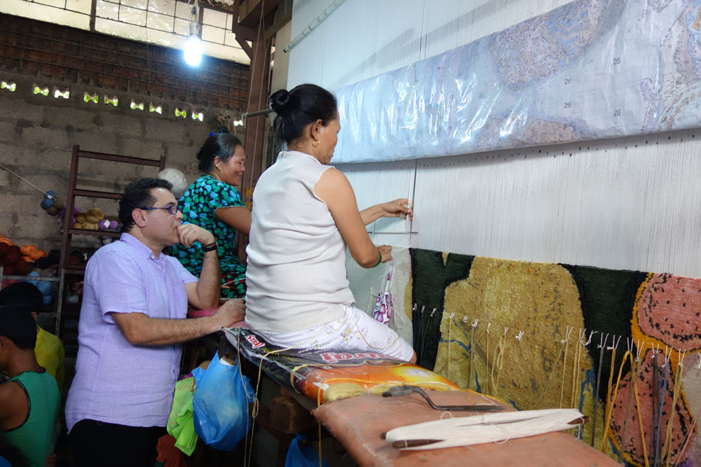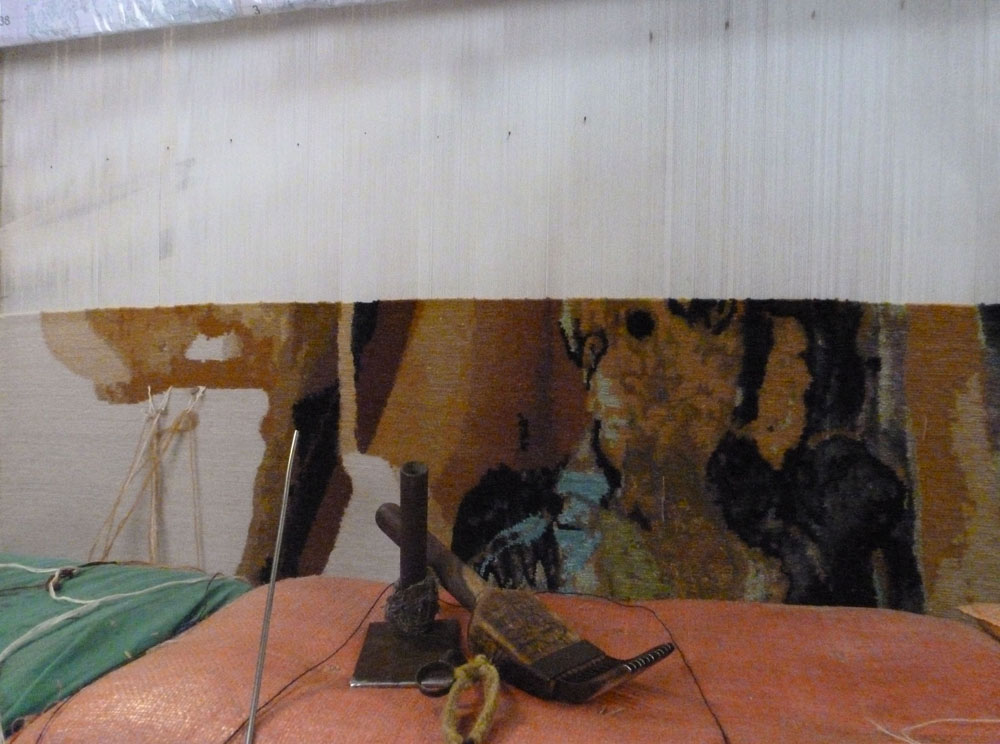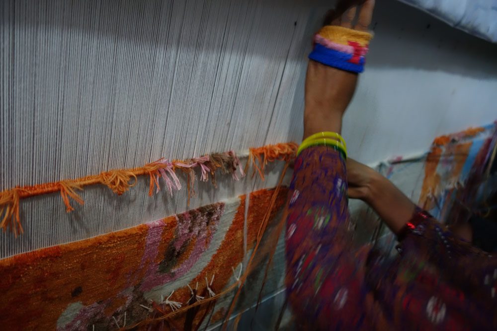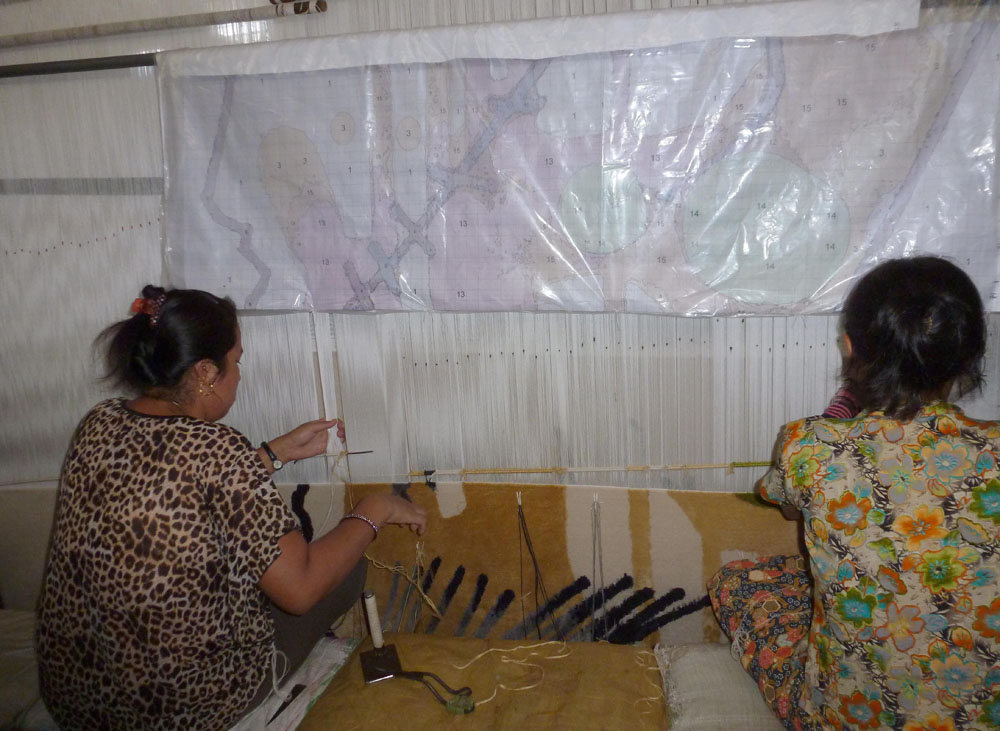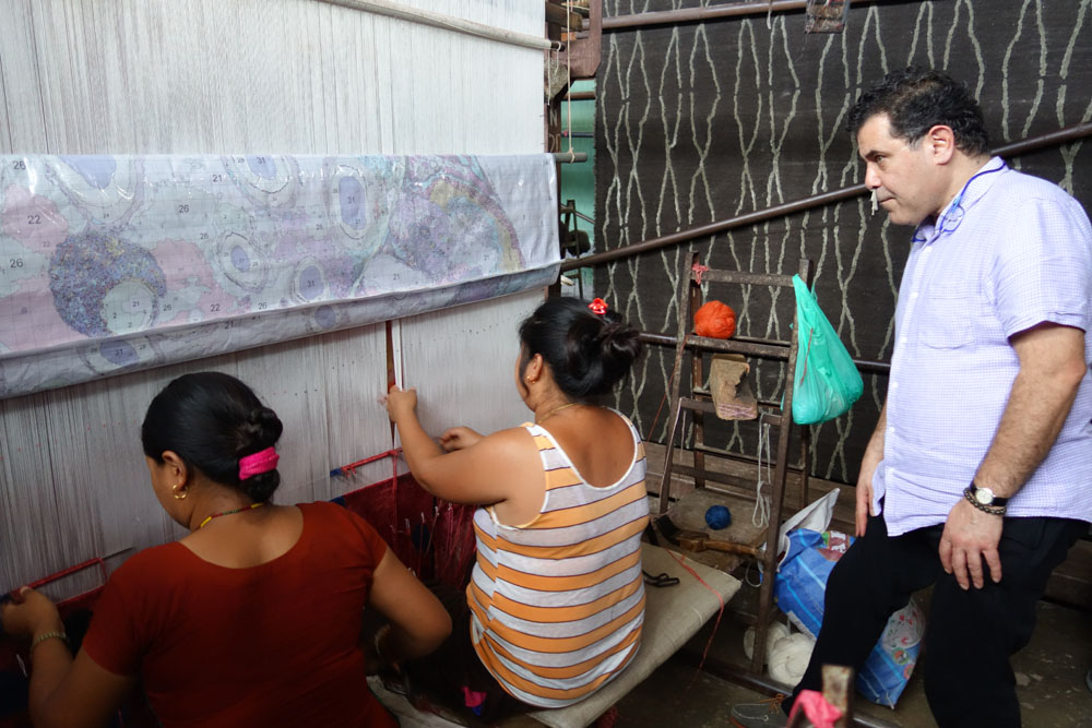 For this project, Behruz selected the most skilled weavers from the workshop. Although all weavers are very talented, some have a finer hand and due to the complexity in the designs this was an important asset to have. The weavers follow the graph in a ‘paint by numbers’ method with each dot of a square on the graph being one knot. They place the yarn around a metal rod and create rows of knots which are then cut with a sharp knife. Once cut, the yarns are then trimmed with scissors to form an even pile. The colours of this collection change very frequently so it was a skill in itself to follow the graph without error. Behruz travelled to Nepal frequently during the weaving process to ensure all colours were woven in the correct place and that the overall look of the weave was a representation to the artwork. With each visit, he was more and more impressed by the weavers who are artists themselves.